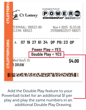 Double Play is another chance to win! When you add Double Play, your Powerball numbers are entered into a second drawing. This opportunity provides the chance to win even more prizes, up to $10 MILLION!